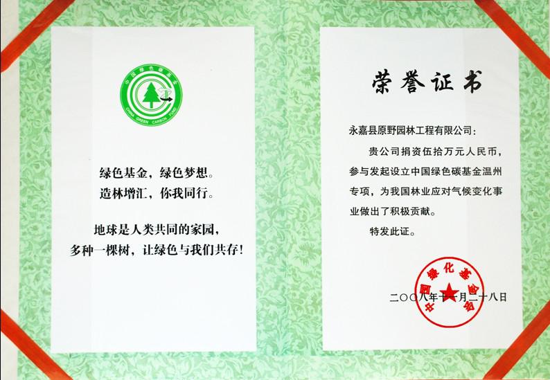 2008年捐贈(zèng)50萬元參與發(fā)起設(shè)計(jì)中國(guó)綠色碳基金溫州專項(xiàng),為我國(guó)林業(yè)應(yīng)對(duì)氣候變化失業(yè)做出了積極貢獻(xiàn)。