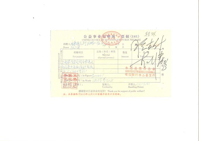 2013年向工商聯(lián)分會永嘉縣文化與遺產(chǎn)傳承保護發(fā)展基金捐款50萬元
