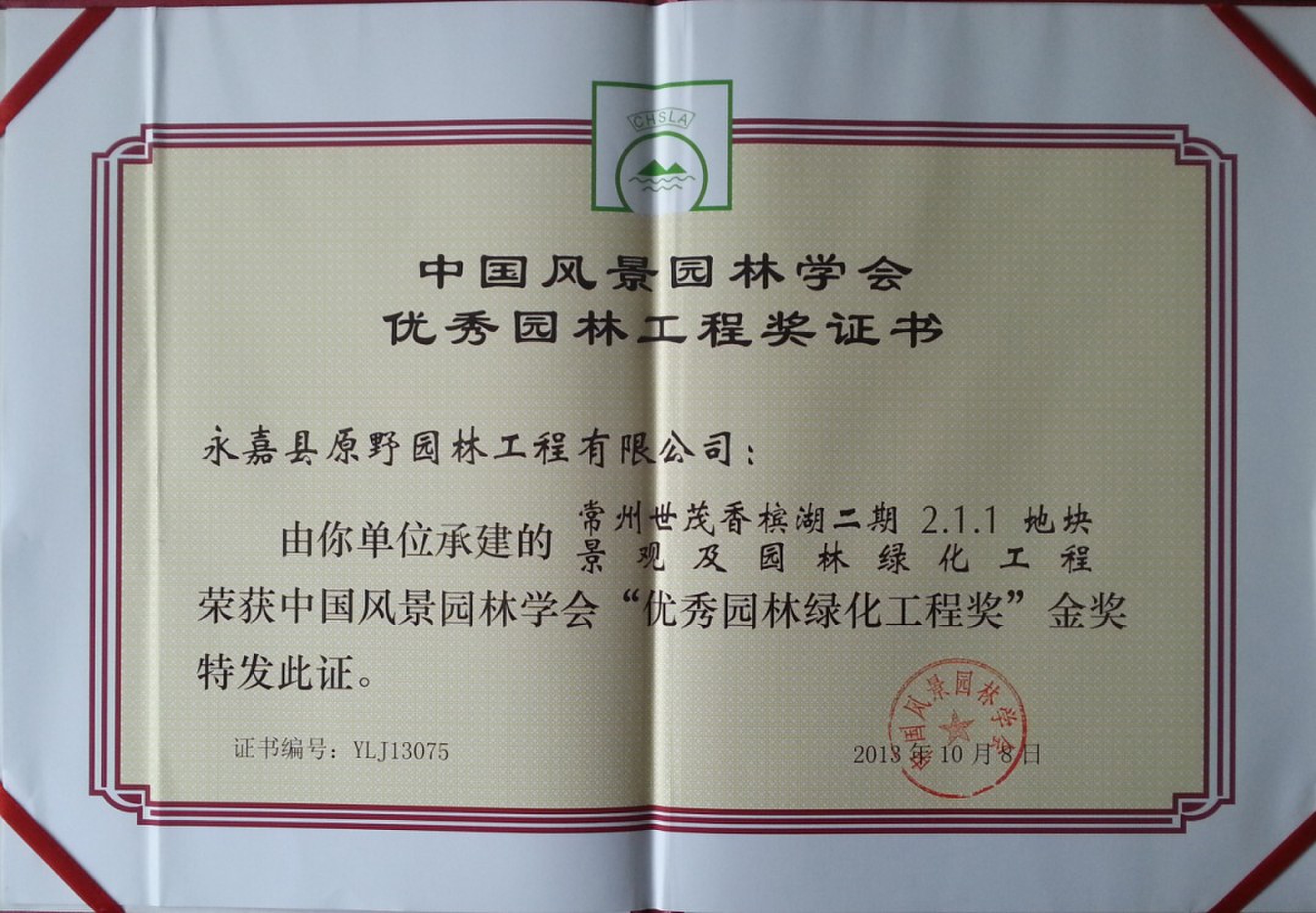 10月25日,由永嘉原野園林公司承建的常州世茂香檳湖二期2.1.1地塊景觀及園林綠化工程獲中國優(yōu)秀園林工程金獎稱號。