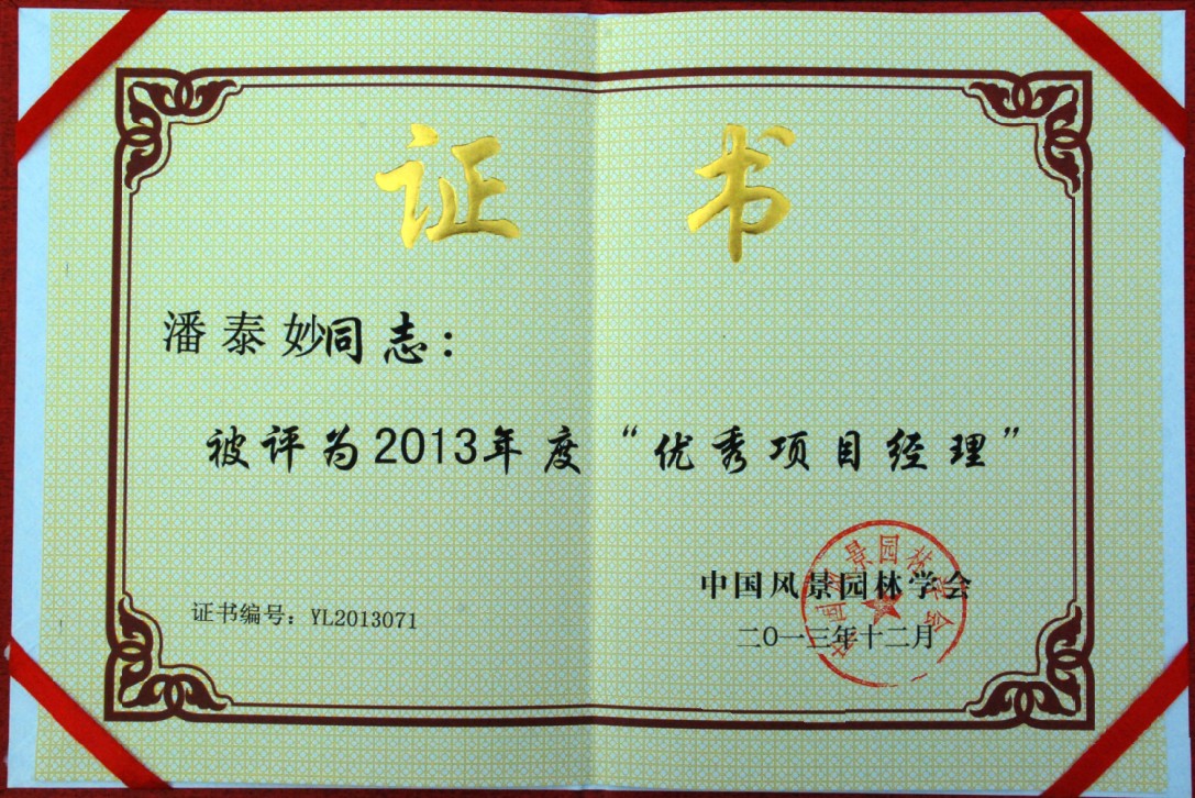 2013-12-2512月23日,中國(guó)風(fēng)景園林學(xué)會(huì)在廣州舉行頒獎(jiǎng)大會(huì)。原野園林公司潘泰妙獲得優(yōu)秀項(xiàng)目經(jīng)理稱號(hào)。