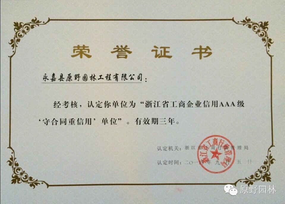 近日,喜報(bào)頻傳,原野連續(xù)獲得兩項(xiàng)榮譽(yù),第一項(xiàng)是浙江省工商行政管理局頒發(fā)的延續(xù)認(rèn)定我司為“浙江省工商企業(yè)信用AAA級守合同重信用”單位。多年來,原野一直恪守誠信經(jīng)營作為企業(yè)立業(yè)之道,興業(yè)之本,構(gòu)筑企業(yè)誠信管理體系,獲得廣大客戶好評。