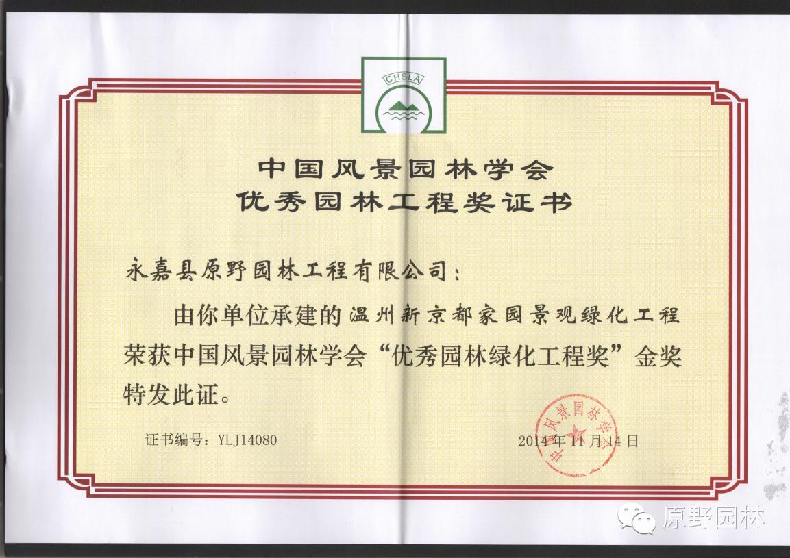 第二項(xiàng)是2012年9月24日通過竣工驗(yàn)收的溫州新京都家園景觀綠化工程獲得中國優(yōu)秀風(fēng)景園林工程金獎(jiǎng),此次國家級金獎(jiǎng)是原野繼常州世茂香檳湖景觀綠化工程項(xiàng)目之后的第二個(gè)國家級金獎(jiǎng),是溫州本土市場上獲得第一個(gè)國家級金獎(jiǎng),意義非凡,在此感謝公司項(xiàng)目部全體同仁的辛勤付出,以及公司其他部門的后勤支持。讓我們再接再厲,拿下更多的國家乃至世界級的大獎(jiǎng)。