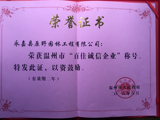 原野公司再獲溫州市第二屆百佳誠信企業(yè)稱號