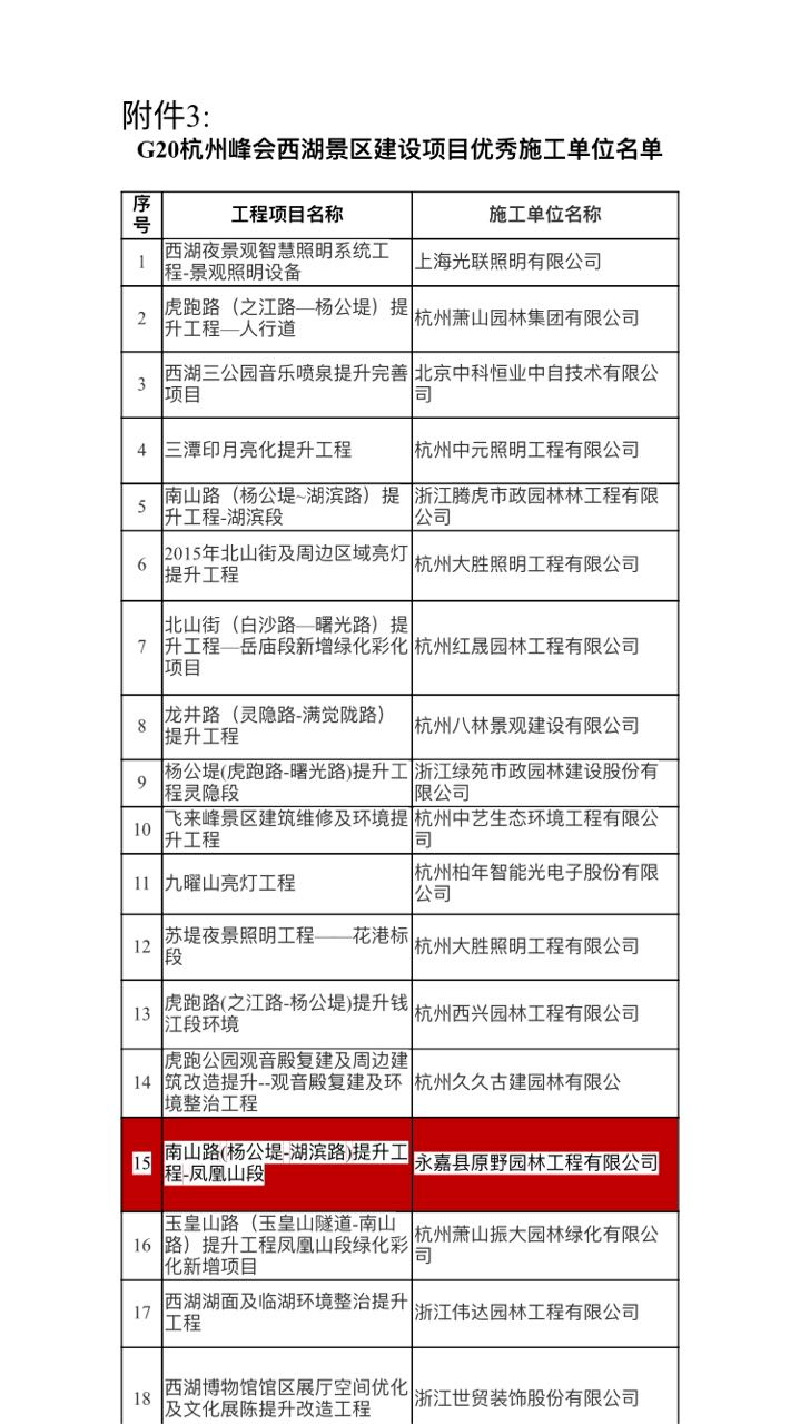 2016年10月,原野公司榮獲 “ 浙江省服務(wù)保障G20杭州峰會優(yōu)秀施工企業(yè)”榮譽稱號。共有二十家企業(yè)獲此殊榮:北京一家,上海一家,溫州一家(原野園林),其余十七家企業(yè)皆為省直或杭州企業(yè)。我司承建的G20項目:南山路(楊公堤—湖濱路 ) 鳳凰山路段提升工程,舊貌換新顏,十步一景,鮮花與綠植相映成趣 , 得到了省、市領(lǐng)導(dǎo)及業(yè)內(nèi)專家的一直好評。