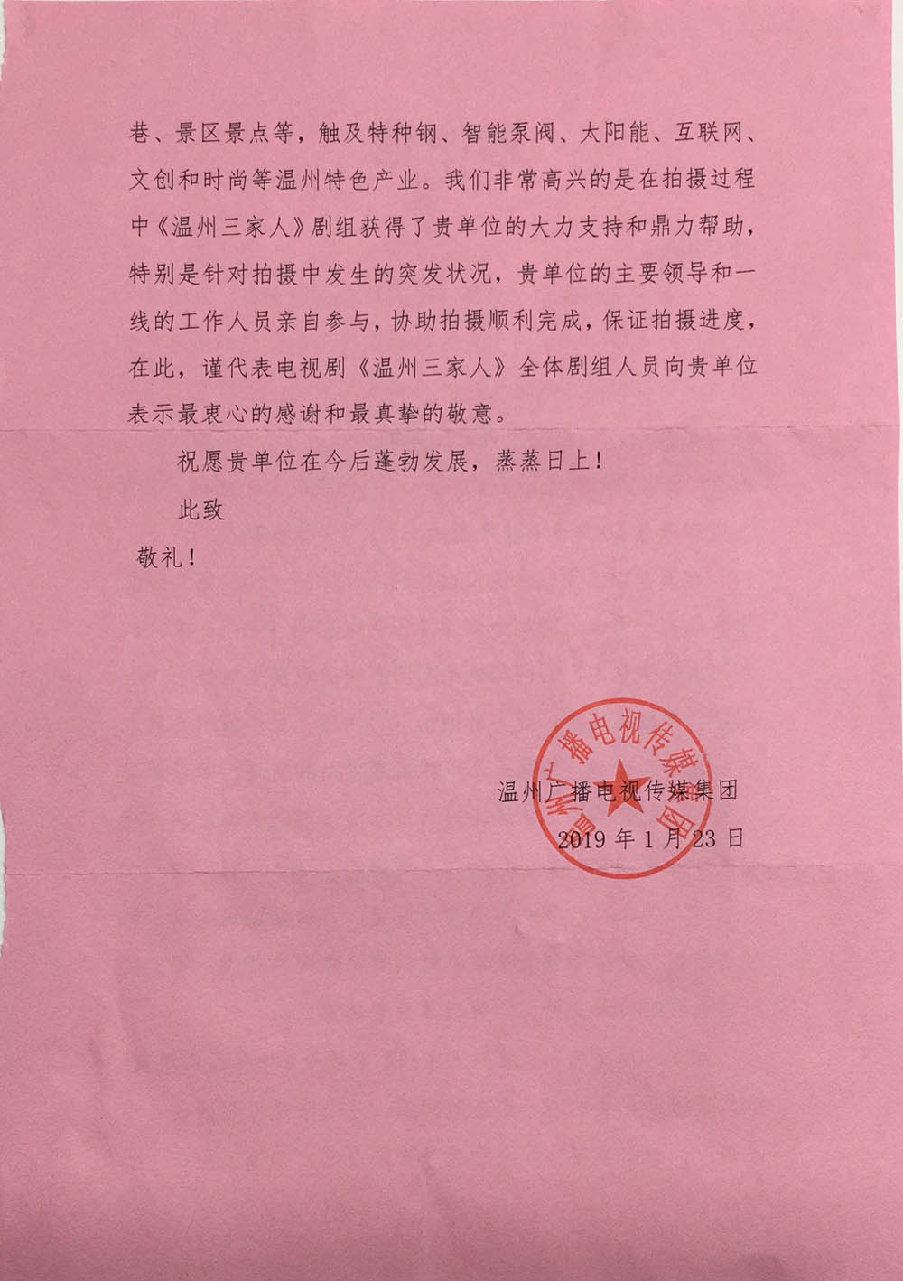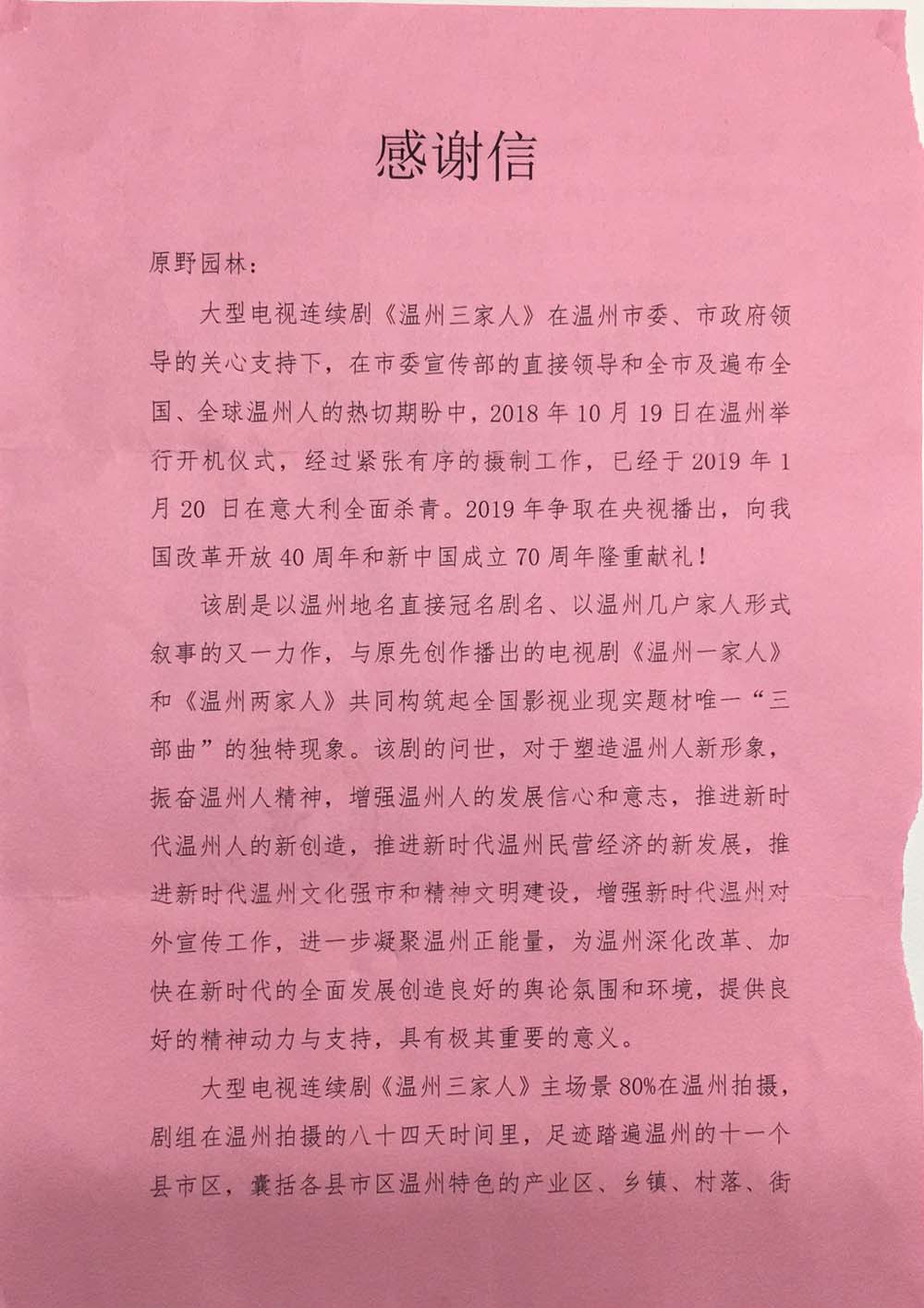 2019-02-012019年1月20日大型電視連續(xù)劇在意大利全面殺青。該劇于2018年10月19日在溫州舉行開機(jī)儀式,計(jì)劃2019年在央視播出,向我國改革開放40周年和新中國成立70周年隆重獻(xiàn)禮!劇中重要?jiǎng)∏樵谠稗r(nóng)莊拍攝。
