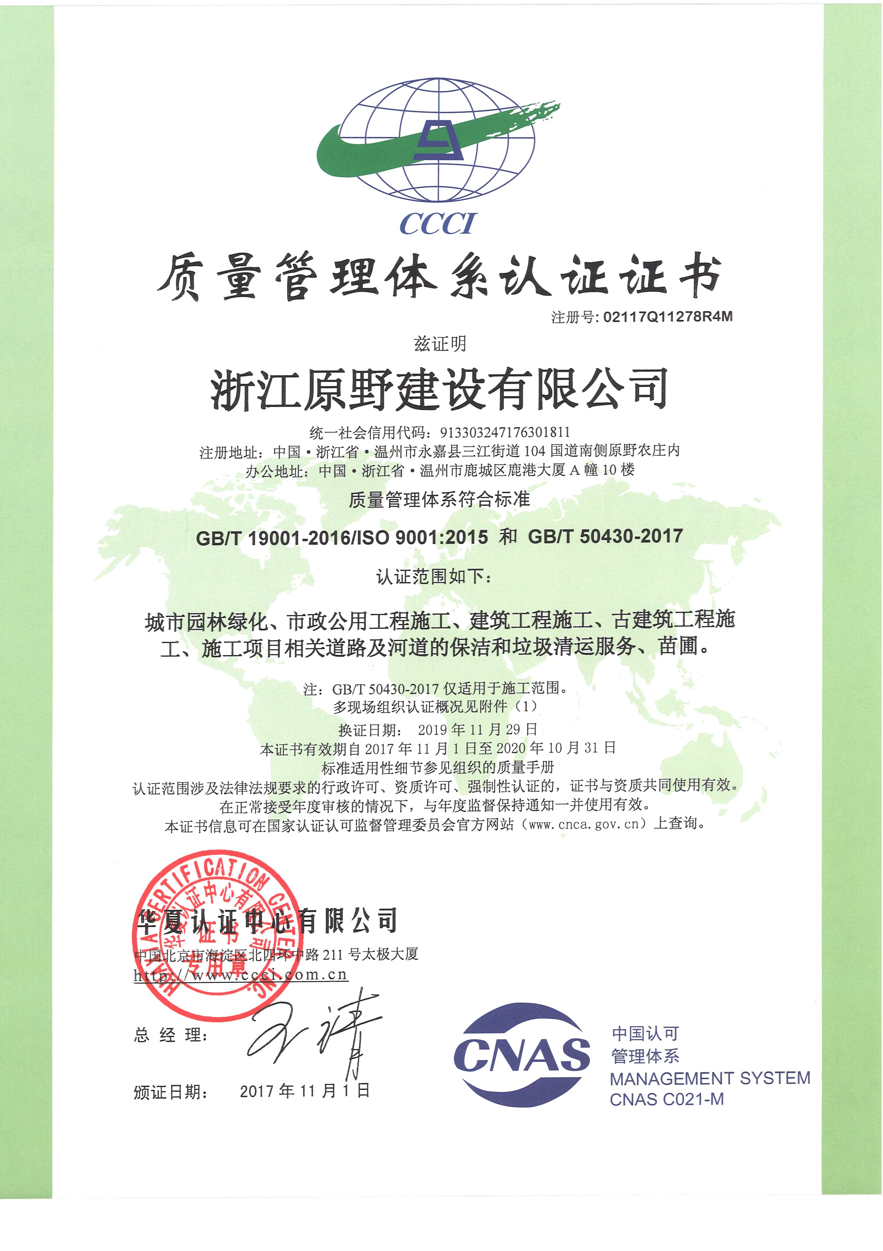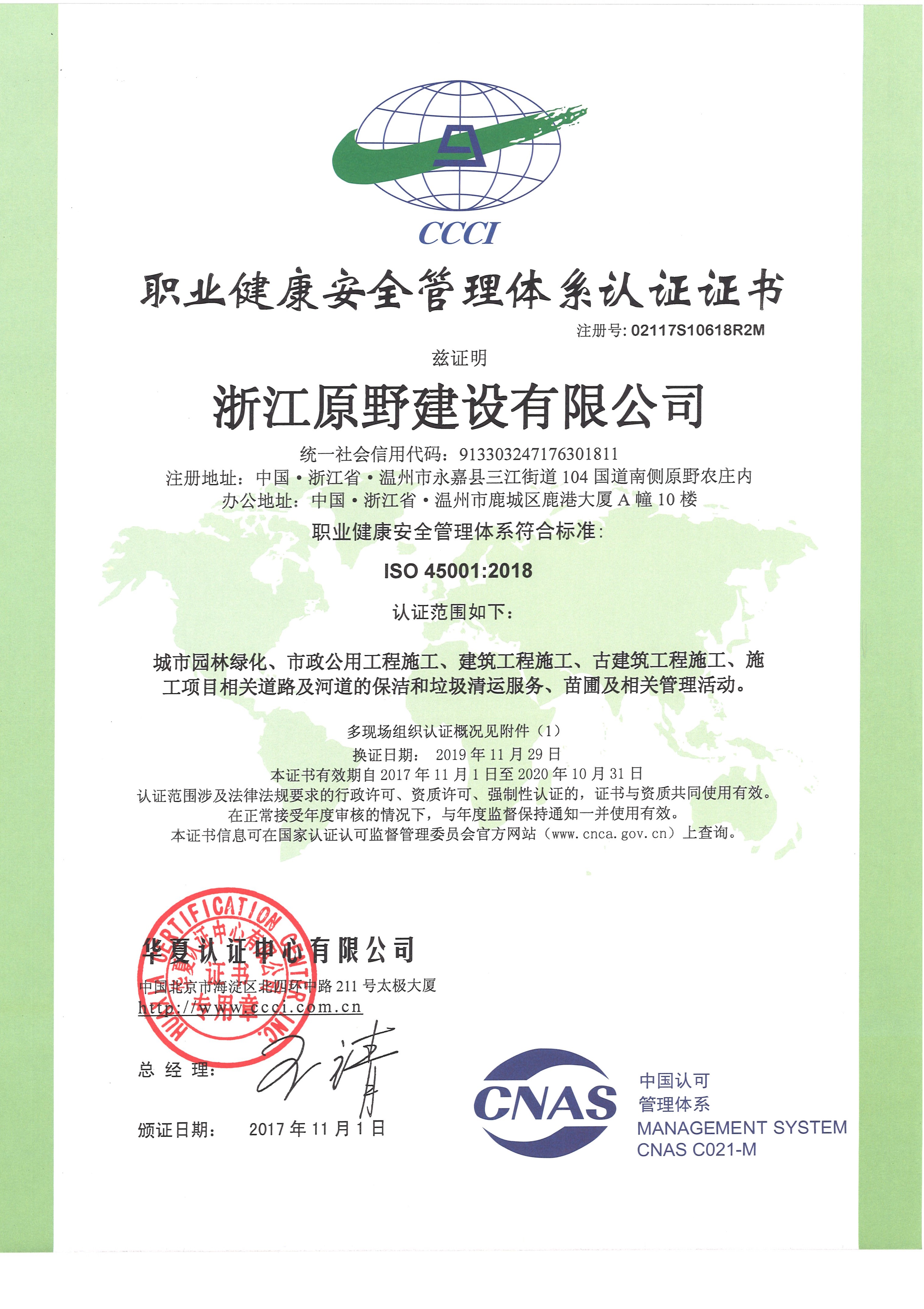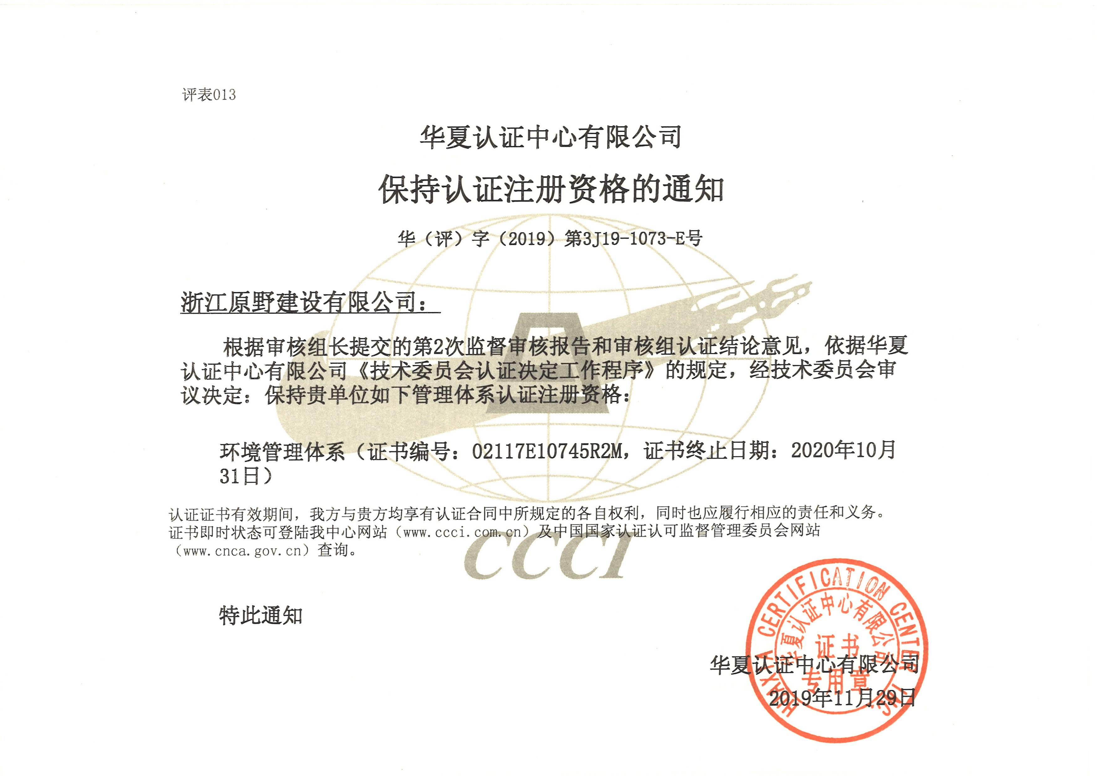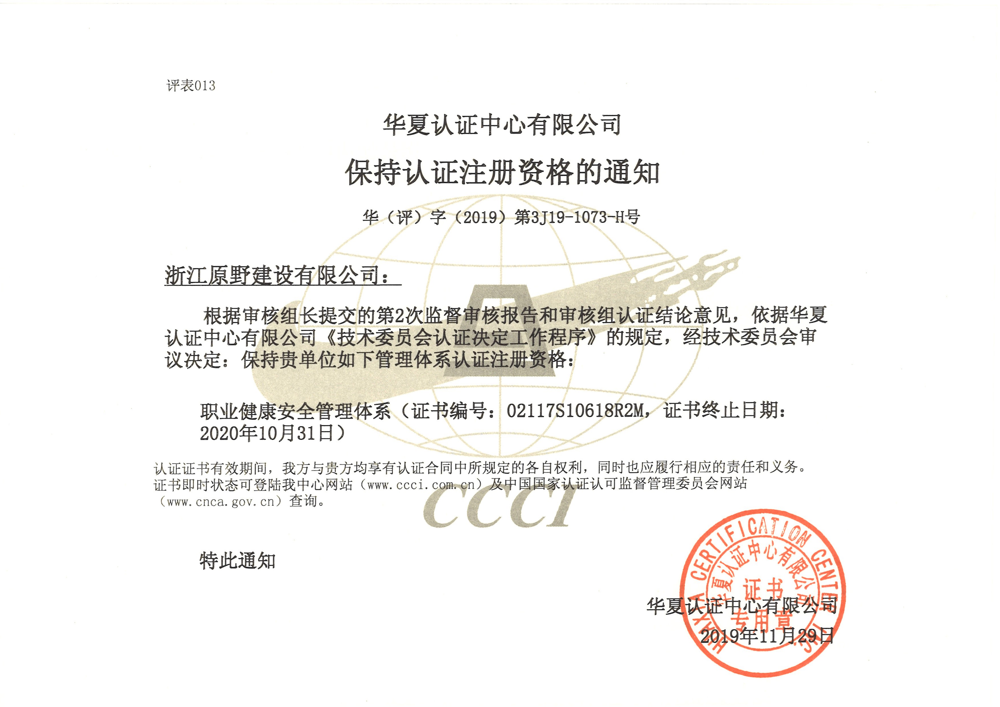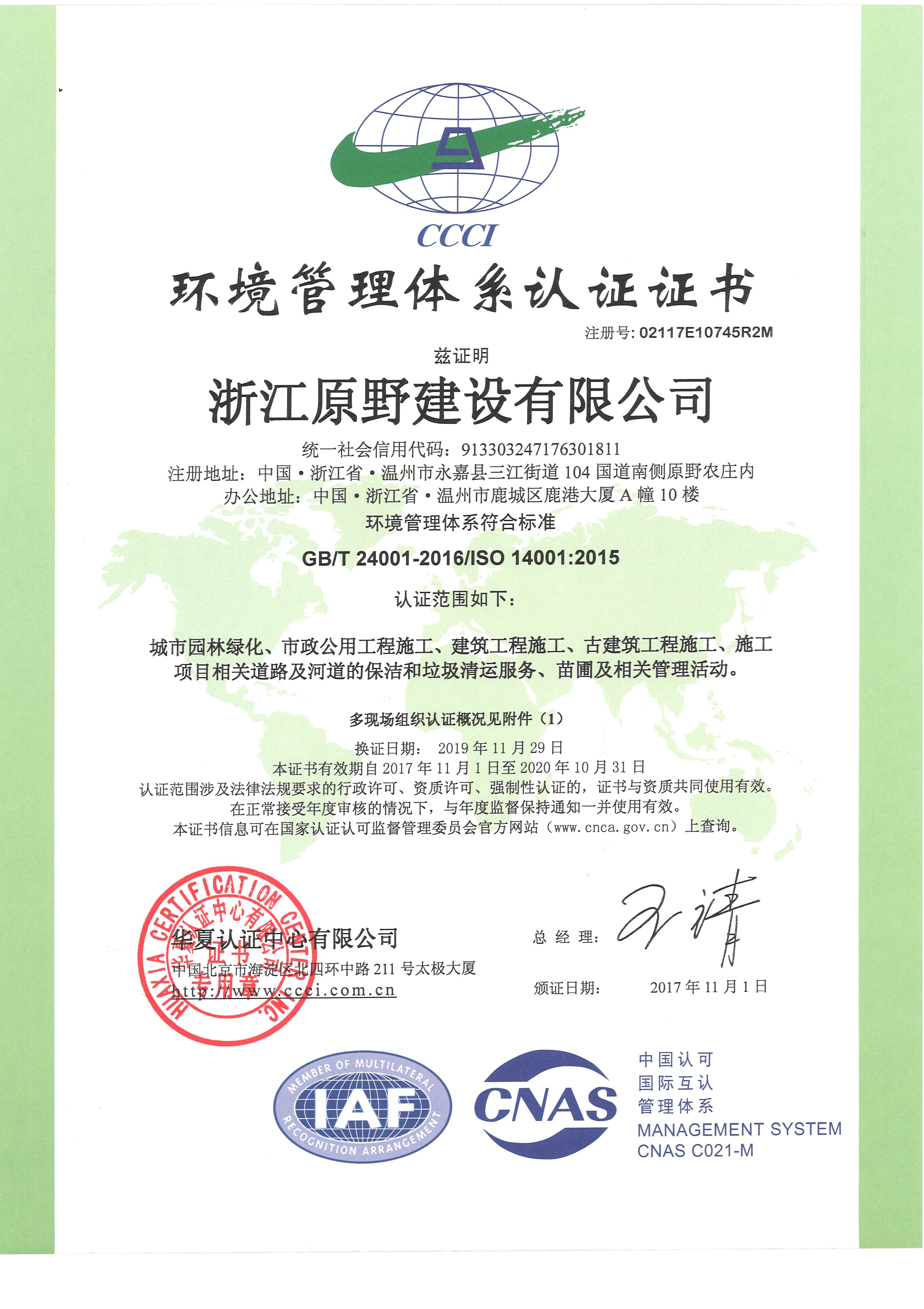 2019年11月,原野集團(tuán)開展ISO三體系復(fù)審工作,華夏認(rèn)證中心有限公司五位專家老師經(jīng)過為期三天的審核認(rèn)證工作和“原野人”的配合與努力,順利頒布認(rèn)證資格證書。