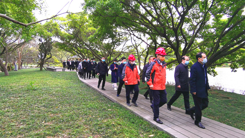 在江心嶼,陳作榮現(xiàn)場查看海眼廣場、臨湖望夕、湖心禪居、禪意慧園、臥龍橋等場所的疫情防控及復工復產情況。江心嶼改造提升工程(東園)EPC項目,目前已完成總工程量的65%,形成了環(huán)共青湖游線。此前,項目總承包單位嚴格建立健全疫情防控機制,落實各項保障措施,于3月1日起全面復工,目前正在集中施工力量推進“五一”節(jié)點項目建設。