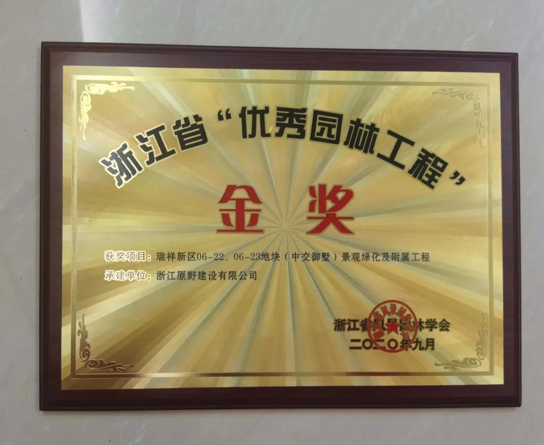 瑞祥新區(qū)06-22、06-23地塊(中交御墅)景觀綠化及附屬工程獲2020年度浙江省“優(yōu)秀園林工程”金獎