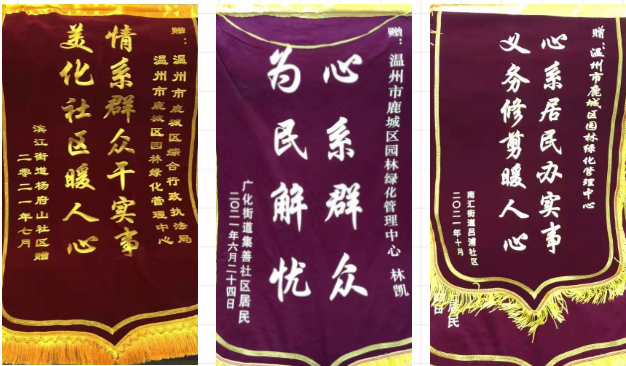 近日,鹿城區(qū)楊府山社區(qū)、集善社區(qū)、呂浦社區(qū)給鹿城區(qū)綜合行政執(zhí)法局與園林綠化管理中心送去錦旗。這是社區(qū)居民對(duì)綜合行政執(zhí)法局與園林綠化管理中心五個(gè)多月來(lái)的貼心服務(wù),所表達(dá)的感謝與肯定。