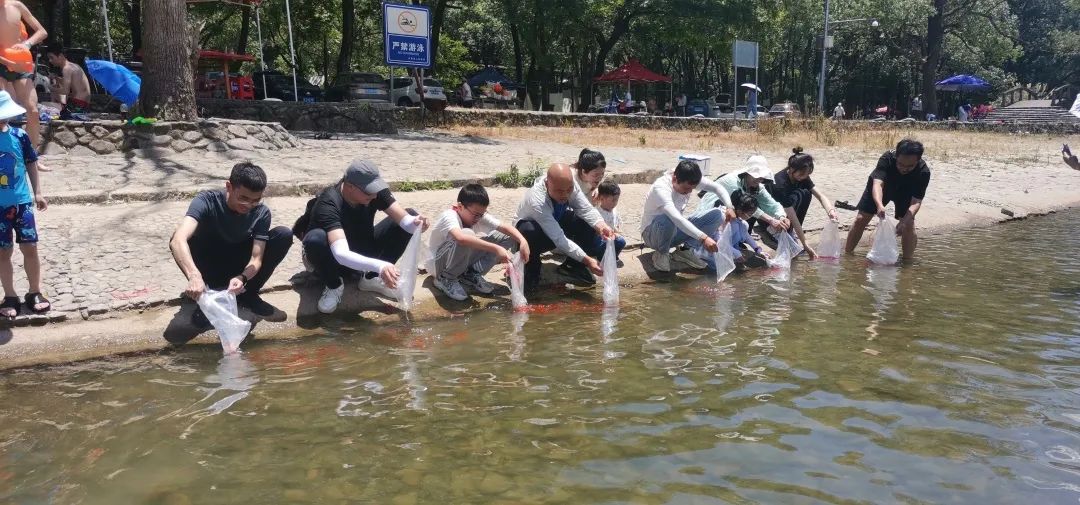 在楠溪江岸邊,一起投放生態(tài)魚苗