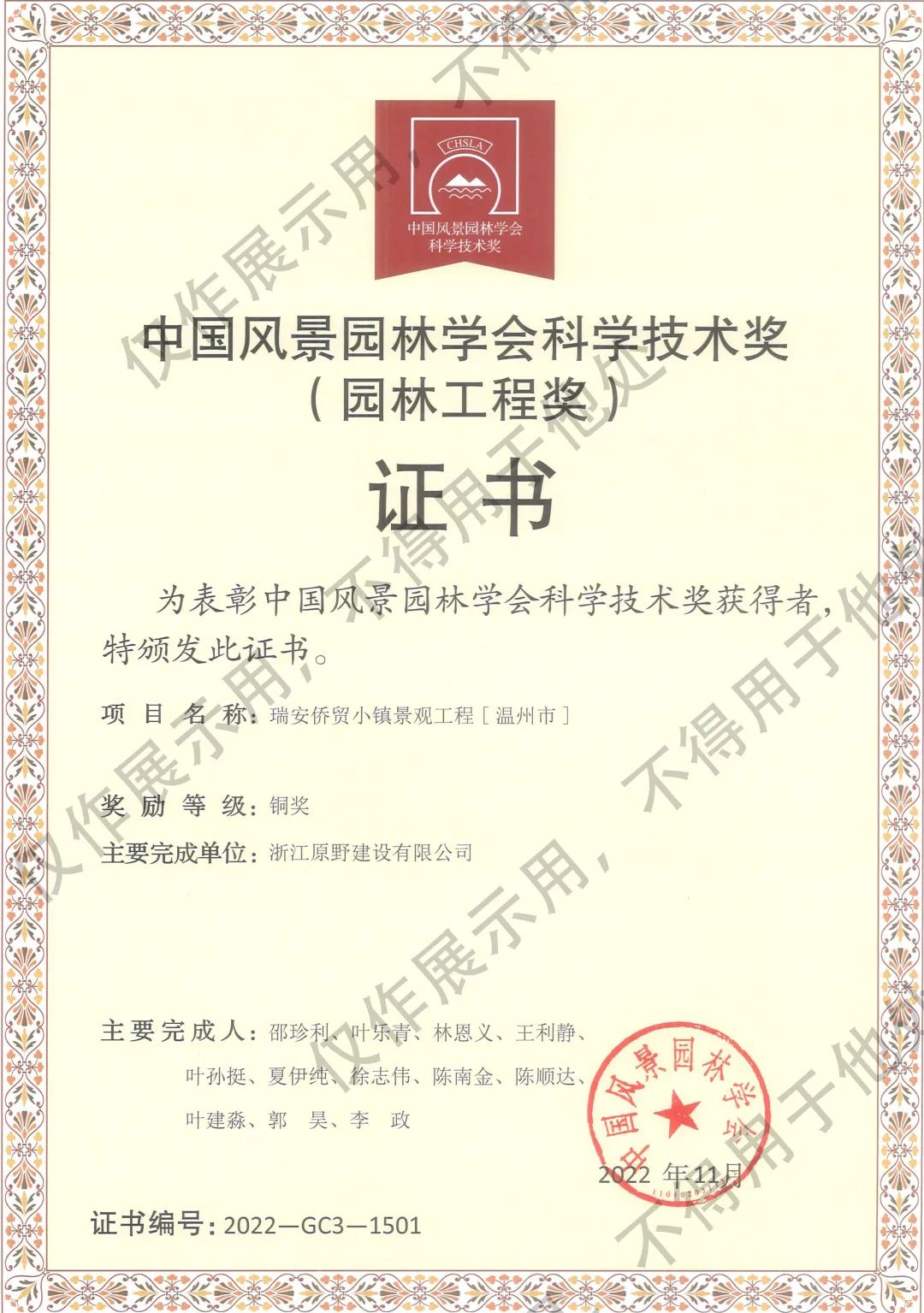 2023-03-24日前,由浙江原野建設(shè)有限公司施工的“瑞安僑貿(mào)小鎮(zhèn)景觀工程”榮獲中國(guó)風(fēng)景園林學(xué)會(huì)科學(xué)技術(shù)獎(jiǎng)(園林工程獎(jiǎng))。