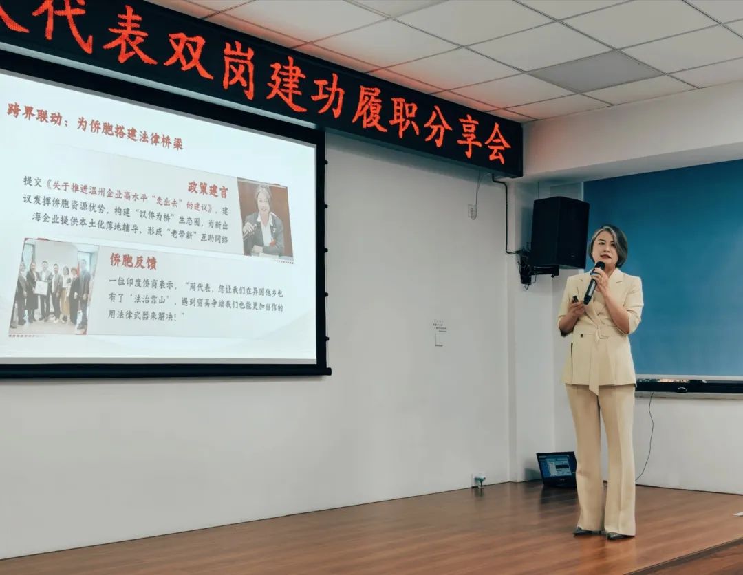 律師代表周春萍以“初心、使命、共振”為核心,分享其”雙崗建功”履職實(shí)踐。律師執(zhí)業(yè)25年的她以個(gè)案?jìng)鬟f法治溫度,如代理抑郁癥婦女離案時(shí),不僅爭(zhēng)取撫養(yǎng)費(fèi),還協(xié)助辦理低保和殘疾補(bǔ)助,讓當(dāng)事人感慨“法律是公平而溫暖的”。當(dāng)選代表后,她將“個(gè)案正義“升華為“制度正義”,針對(duì)“落戶(hù)難”兒童撰寫(xiě)《行政審批服務(wù)“深水區(qū)"改革建議》,推動(dòng)政策破冰;提交《光污染防治建議》促成溫州首部光污染法規(guī)出臺(tái),明確玻璃幕墻反光標(biāo)準(zhǔn),惠及32個(gè)小區(qū)5萬(wàn)居民。她發(fā)揮“律師+代表"雙重優(yōu)勢(shì),參與洞頭“海上花園”立法,吸納80余條群眾建議,推動(dòng)海域確權(quán)登記制度落地;聯(lián)合百家律所成立“千百會(huì)”法律服務(wù)團(tuán),為68萬(wàn)海外僑胞提供跨境維權(quán)支持,挽回經(jīng)濟(jì)損失超2億元,被僑胞譽(yù)為“法治護(hù)身符”。以專(zhuān)業(yè)力量破解民生難題,以制度建言推動(dòng)法治進(jìn)步,實(shí)現(xiàn)“個(gè)案解民憂(yōu)、立法惠民生、跨界促共治”,彰顯人大代表”雙崗建功”的示范價(jià)值。