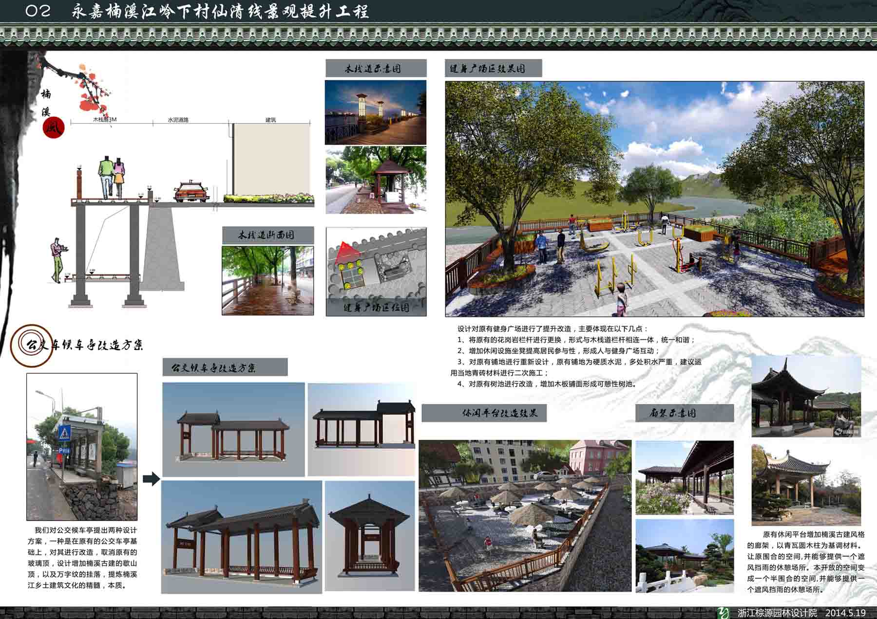 本次設計對楠溪江嶺下村公共設施進行改造,增加休閑仿古廊亭、景觀木棧道、對公交站臺及運動強身區(qū)進行修繕提升。設計遵守“嚴格保護、統(tǒng)一管理、合理開發(fā)、永續(xù)利用“的原則,把生態(tài)環(huán)境放在首位,為全面建設楠溪江旅游文化品位