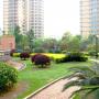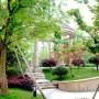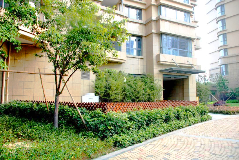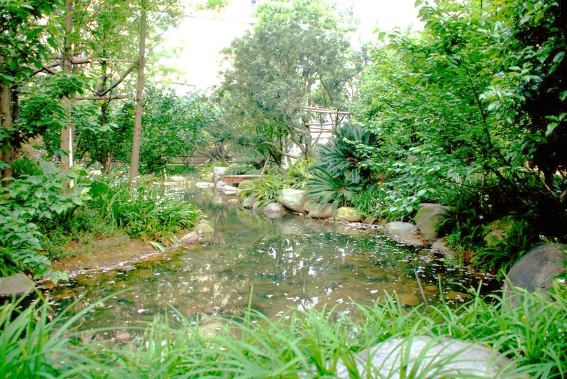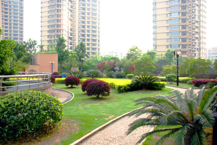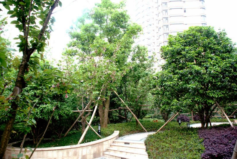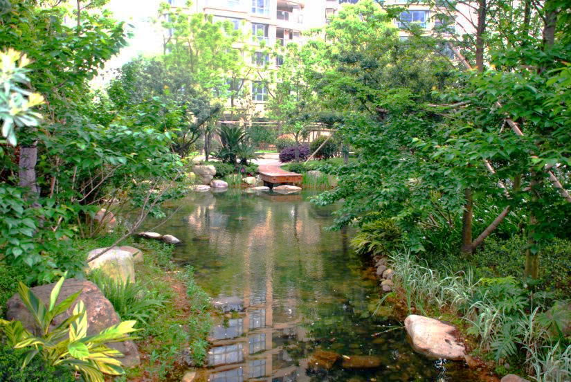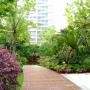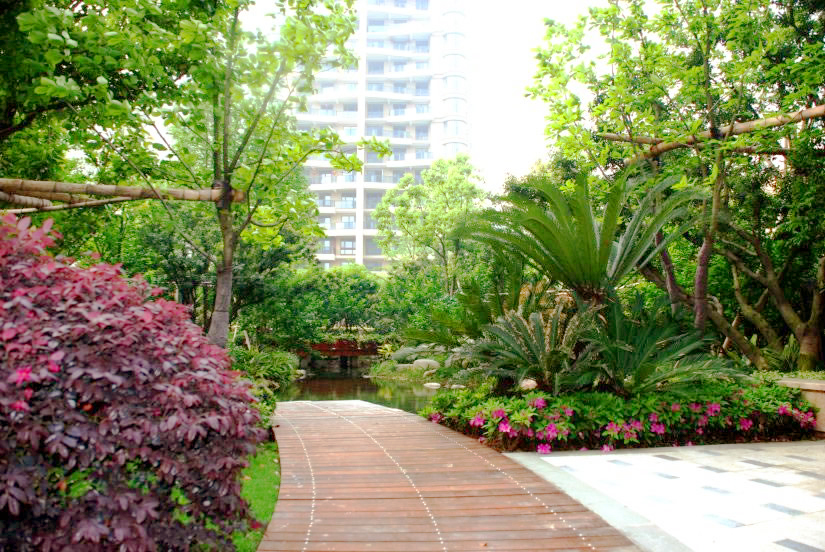 泳池、木質(zhì)小路、綠色屏障般四季長青的中庭景觀
