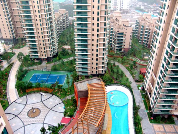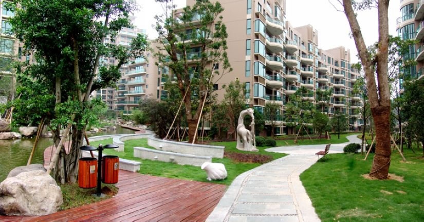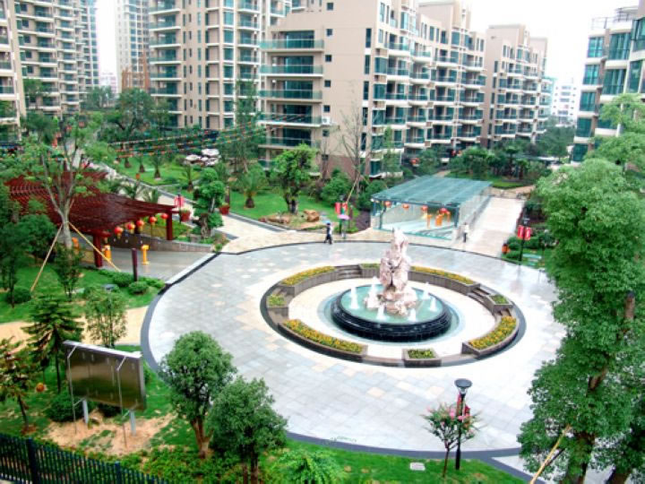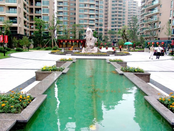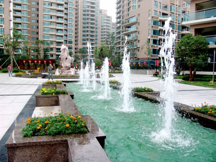 中西方藝術(shù)交融的中庭景觀、氣勢(shì)恢宏的中央軸心噴水渠營(yíng)造水綠相接的自然住宅景觀